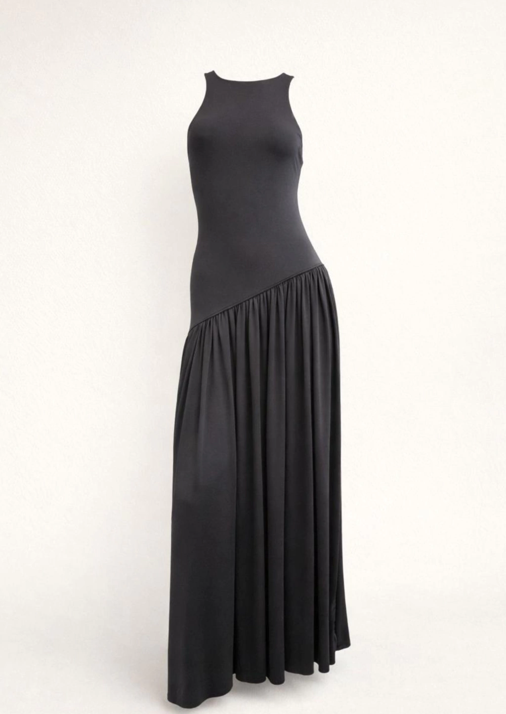 Com modelagem ajustada na parte superior e saia ampla com movimento fluido, o vestido entrega um visual imponente e harmonioso. O corpo estruturado valoriza a silhueta, enquanto a saia longa com leve volume proporciona leveza e sofisticação ao caminhar.